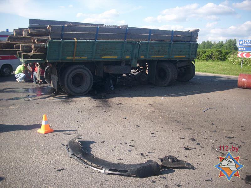 ДТП с участием грузового автомобиля "КАЗ" и автомобиля "Фольксваген-Пассат В5" произошло на трассе М-11 Лида - Вильнюс, на выезде из Лиды, 7 июня после 17 часов.