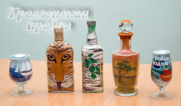 Технику sand bottle бухгалтер ОАО "Стеклозавод "Неман" освоила несколько лет назад случайно. В отпуске по уходу за младшей дочерью Юлианой время тянулось медленно, непременно хотелось заняться чем-то необычным. Вопреки сомнениям, первый результат Людмилу обрадовал: сувенир получился весьма аккуратный и оригинальный. И ничем не уступал тем, которые знакомые привозили из арабских стран.